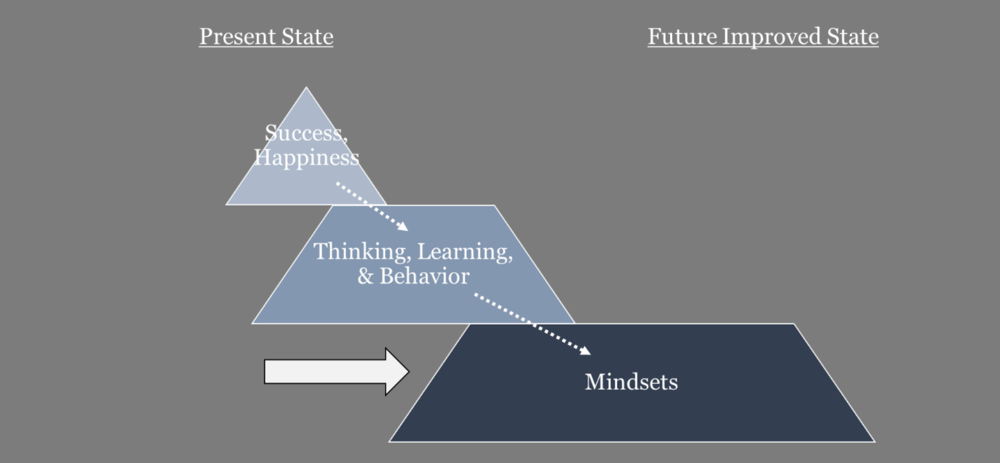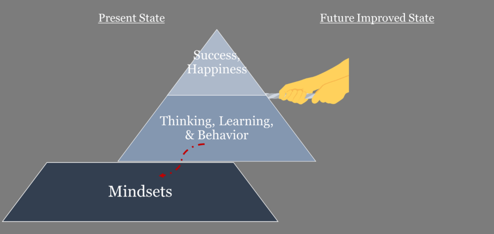 But, since learning about mindsets, I have come to realize that I have been missing a huge piece of the personal development puzzle, even the foundation: my mindsets. While the figure above is what I have seen in my attempts to develop, I have overlooked the role and importance of mindsets as part of the equation. In fact, the figure below is actually a more accurate representation of what has been going on.