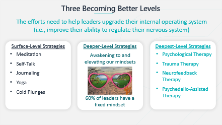 During our discussion, I shared the following slide, which corresponds with the content in my new book, Becoming Better: The Groundbreaking Science of Personal Transformation, identifying different levels of activities that we can engage in: