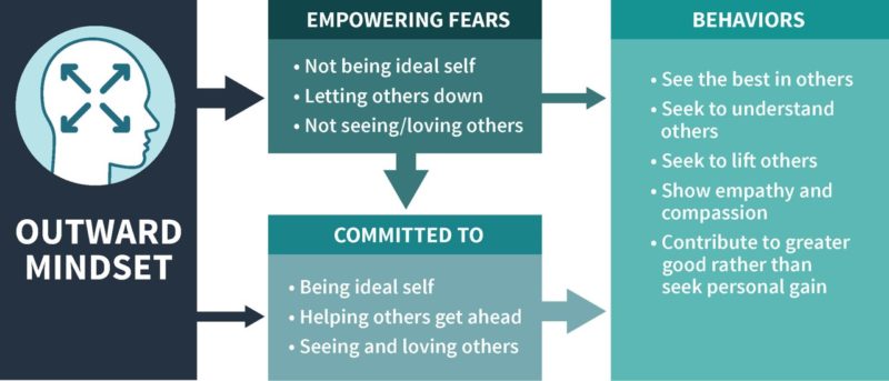 When we have an outward mindset, we develop more healthy fears and commitments. Rather than being focused on our personal advancement, we fear not being our ideal selves, letting others down, and not seeing and loving others. These fears drive us to develop the healthier commitment of being a positive contributor by being our best self, helping others get ahead, and seeing and loving others. When we apply an outward mindset, we see the best in others, are more understanding and empathetic, and seek to lift others (as opposed to lifting just ourselves).